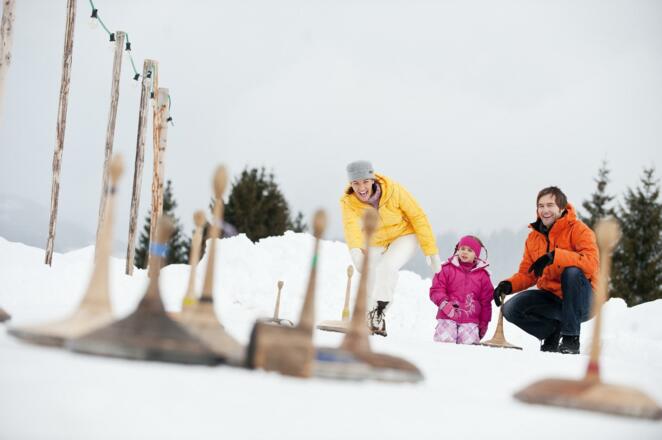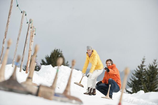 Eisstockschießen für Gäste – auf der Eisbahn (Nähe Sportplatz). Stöcke sind vorhanden. Für