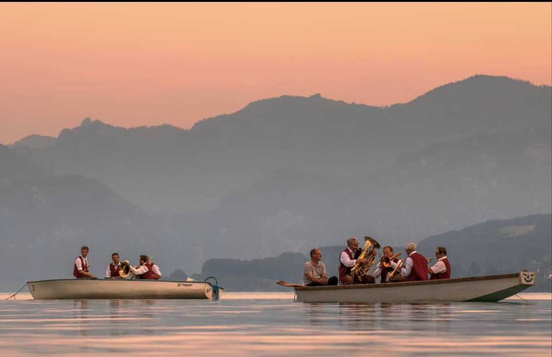 Die Musikkapelle Weyregg veranstaltet ein Seeblasen - eine Gruppe Musikanten fährt im Boot auf dem See und spielt Weisen für die Zuhörer am Ufer - nur bei ruhiger See!