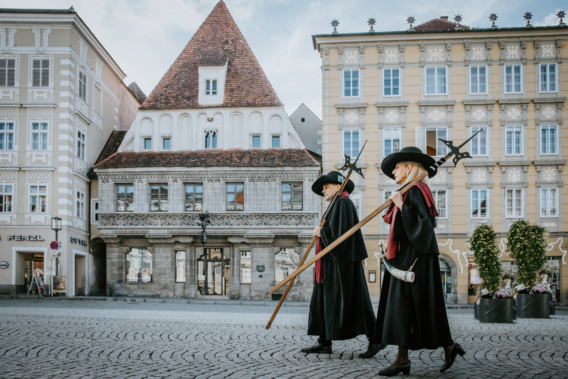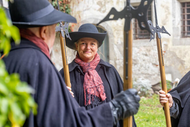 Due guardie notturne in uniforme tradizionale con alabarda e lanterna vi aspettano cantando la famosa canzone delle guardie notturne: "Alle meine liabn Herrn und Frauen, lasst euch sagen:..." Le guardie notturne di Steyr vi accompagneranno dalla torre più alta alla cantina più profonda raccantando aneddoti sul movimentato passato della città medievale e romantica di Steyr.