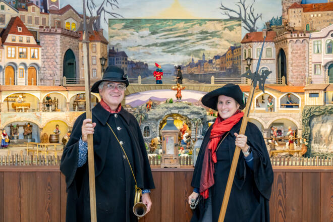 A night watchman in traditional costume with halberd and lantern awaits you with the famous night watchman song "Alle meine liabn Herrn und Frauen, lasst Euch sagn...". After welcoming you with a glass of sparkling wine in the night watchman's restaurant