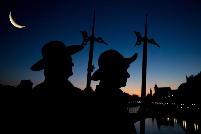 The Steyr night watchmen in traditional costume with halberds, lanterns, and horns await you on the terrace of the Orangery.