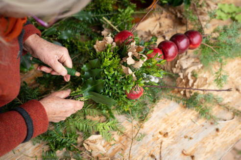 In preparation for Palm Sunday, the tradition of tying „palm bundles“ for blessing takes place. The bundles usually include small branches of juniper, holly, thuja, box, yew, pussy willow, hazel. The bundles are often decorated with apples, ribbons and slivers of bark. After being blessed during Palm Sunday services the bundles are placed on home crucifixes or displayed on long sticks in fields.