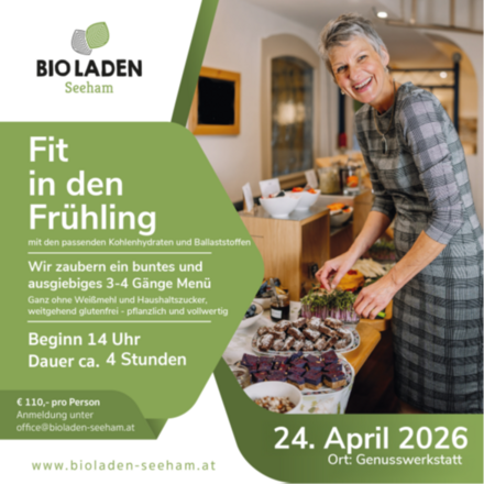 Wir zaubern ein buntes und ausgiebigs 3-4-Gänge-Menü ganz ohne Weißmehl und Haushaltszucker – pflanzlich und vollwertig. Genusswerkstatt im BioArt Campus Seeham. Dauer 4 Stunden. 110 Euro pro Person. Anmeldung erforderlich, begrenzte Teilehmer. Tel. +43(0)6217/59218 oder office@bioladen-seeham.at