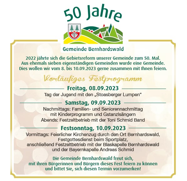 2022 jährte sich die Gebietsreform unserer Gemeinde zum 50. Mal. Aus ehemals sieben eigenständigen Gemeinden wurde eine Gemeinde. Dies wollen wir vom 8. bis 10. September 2023 gerne zusammen mit Ihnen feiern. Vorläufiges Festprogramm: Freitag, 8. September 2023: Tag der Jugend mit den „Stoasberger Lumpen“ Samstag, 9. September 2023:Nachmittags: Familien- und Seniorennachmittag mit Kinderprogramm und GstanzlsängernAbends: Festzeltbetrieb mit der Toni Schmid Band Festsonntag, 10. September 2023:Vormittags: Feierlicher Kirchenzug durch den Ort Bernhardswald, Festgottesdienst beim Sportplatz,anschließend Festzeltbetrieb mit der Blaskapelle Bernhardswald und der Bayernkapelle Andreas Schmid Die Gemeinde Bernhardswald freut sich, mit ihren Bürgerinnen und Bürgern dieses Fest feiern zu können und bittet Sie, sich diesen Termin vorzumerken!