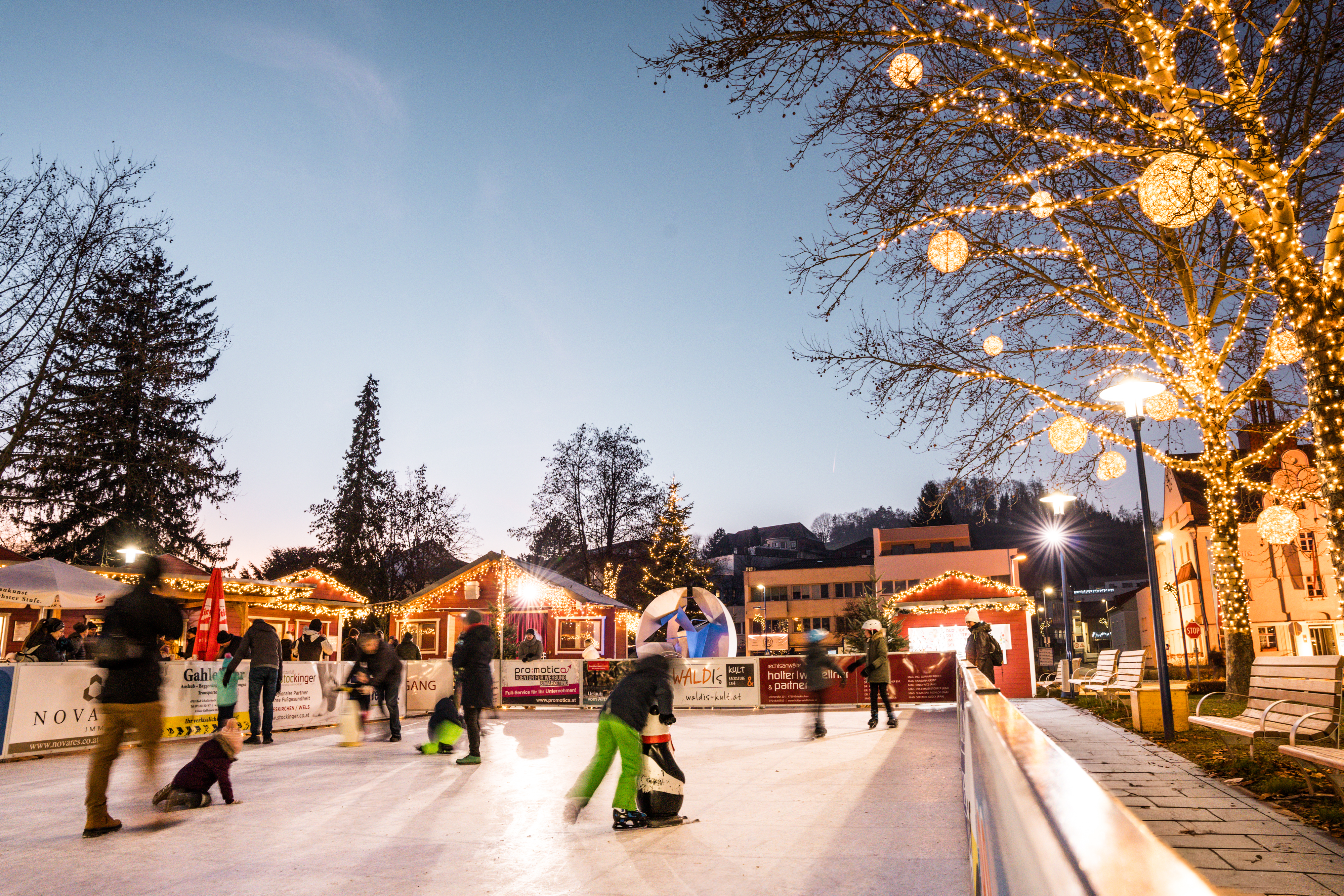Vom Bad Schallerbacher Winterdorf nicht wegzudenken und Highlight für die kleinsten Besucher/-innen ist die 200 Quadratmeter große, klimafreundliche Kunsteisfläche, die mitten auf dem Rathausplatz für unbeschwerten Eislaufspaß sorgt. Dank 58 regionaler Sponsorpartner zählt die Eisfläche zum fixen Bestandteil des Winterdorfes. Für diejenigen, die spontan eine Runde drehen wollen, stehen direkt vor Ort Eislaufschuhe in unterschiedlichen Größen und Kufen zum kostenlosen Verleih zur Verfügung. Die lustigen Eislaufhilfen in Form von Pinguin und Eisbär unterstützen bei den ersten Schritten auf der Kunsteisfläche, sodass einem unbeschwerten Eislaufvergnügen nichts im Wege steht.