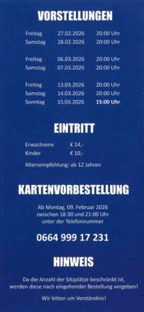 Kartenvorverkauf: ab 09. Feber 2026 zwischen 18:30 und 21 Uhr unter Tel. +43 664 999 17 231