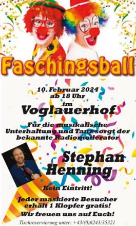 Faschingsball am Voglauerhof! Für die musikalische Unterhaltung und Tanz sorgt der bekannte Radiomoderator Stephan Henning.