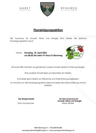 Der Ausschuss für Umwelt, Klima und Energie führt wieder die jährliche Flurreinigungsaktion durch und ladet hiermit die Bevölkerung recht herzlich zur Teilnahme und Unterstützung ein.
