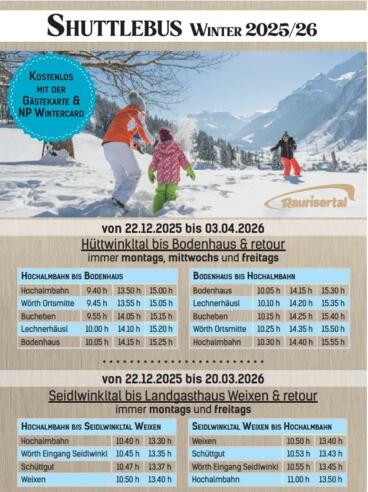 Die Fahrpläne sind im Tourismusbüro erhältlich! Mit der Raurisertal Gästekarte und der Nationalpark Wintercard kostenlos!