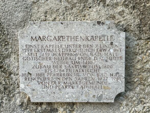 De kerk, die vaak ook wel "kerk onder de zeven lindebomen" wordt genoemd, bestond echter al langer. Want rond 1280 werd St. Margarethen am Anger de rechtsplaats en locatie voor de verkiezing van de burgemeester. Vanwege haar betekenis voor het burgerlijke leven werd de Margarethenkapel het symbool voor het wapen dat aan de plaats Hall was verleend. U kunt de kapel op elk moment zonder afspraak bezoeken.