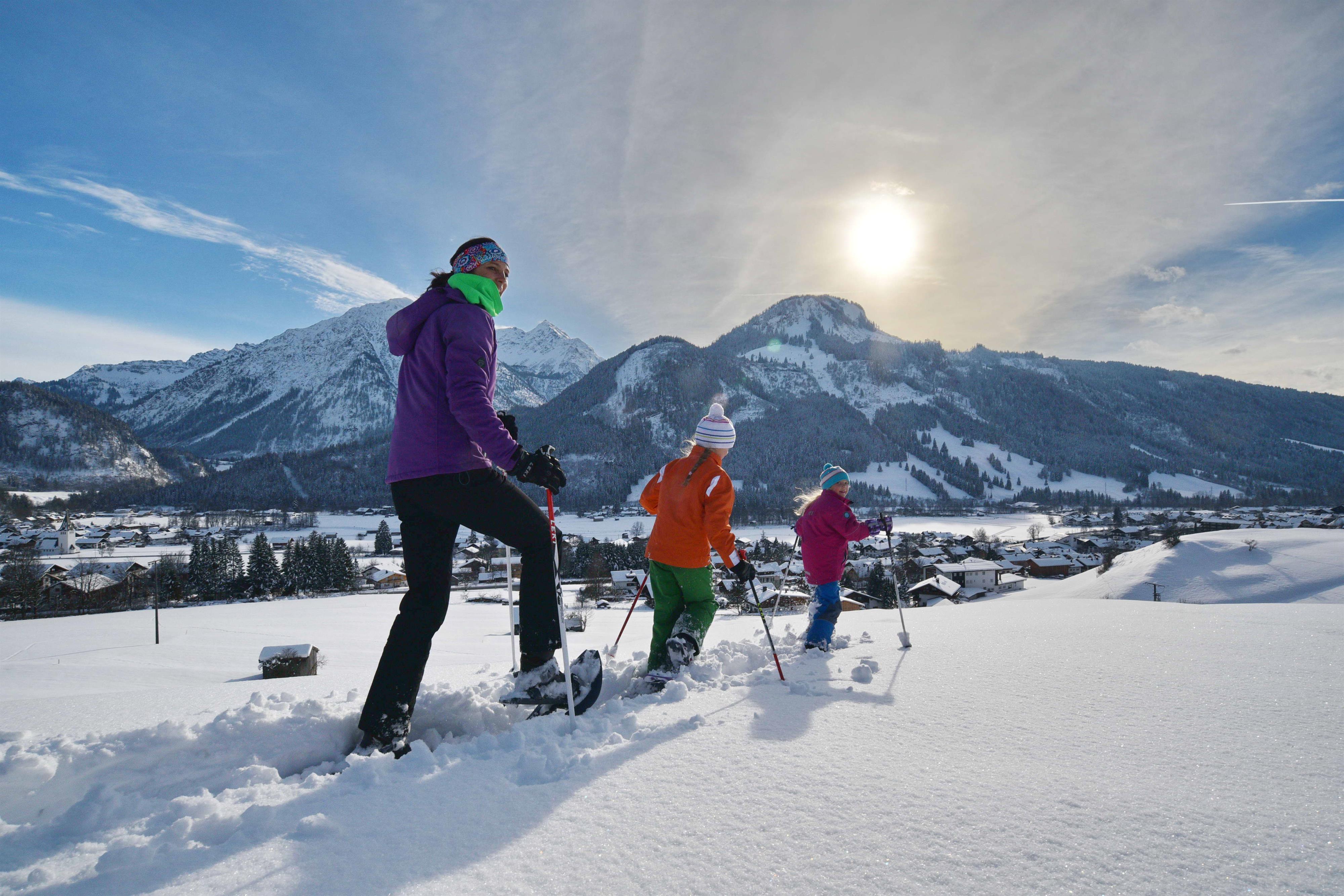 Ihr stapft mit Schneeschuhen durch frischen, glitzernden Pulverschnee. Jeder Schritt weg vom Alltag – jeder Atemzug klare, kalte Bergluft. Nichts außer Winter, Stille, Weite und diesem wunderschönen Panoramablick, der sich anfühlt wie ein Kurzurlaub im Kopf.