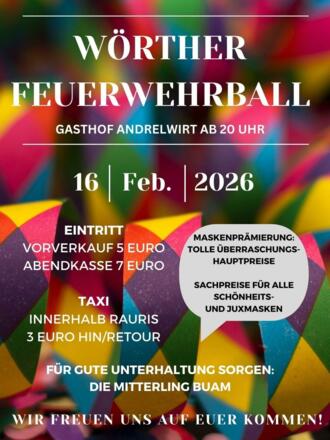 Die Feuerwehr Wörth lädt zum alljährlichen Faschingsball ein. Jede Maskierung gewinnt einen Preis, jeder kann teilnehmen! Für musikalische Unterhaltung sorgen die "Die Mitterling Buam".