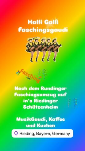 Halli Galli Faschingsgaudi 2025Nach dem Rundinger Faschingsumzug auf ins Riedinger Schützenheim zu Kaffee, Kuchen & Musikgaudi