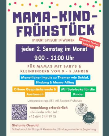 - Mama-Kind Frühstück mit Stefanie Oswald, jeden 2. Samstag im Monat, nächster Termin, Samstag, 11. April 2026, 9.00 bis 11.00 Uhr
