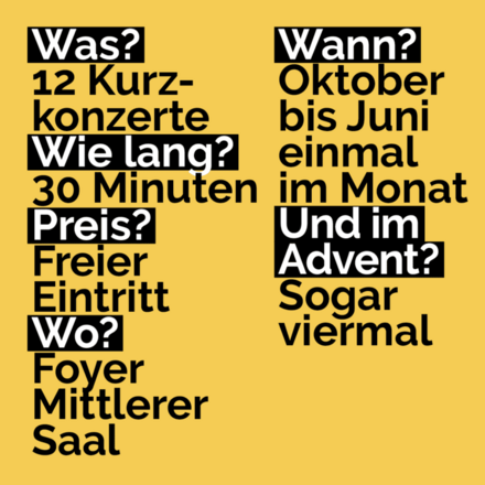 Was? – 12 Kurzkonzerte | Wie lang? – 30 Minuten | Preis? – Freier Eintritt | Wo? – Foyer Mittlerer Saal | Wann? – Von Oktober bis Juni einmal im Monat | Und im Advent? – Sogar viermal