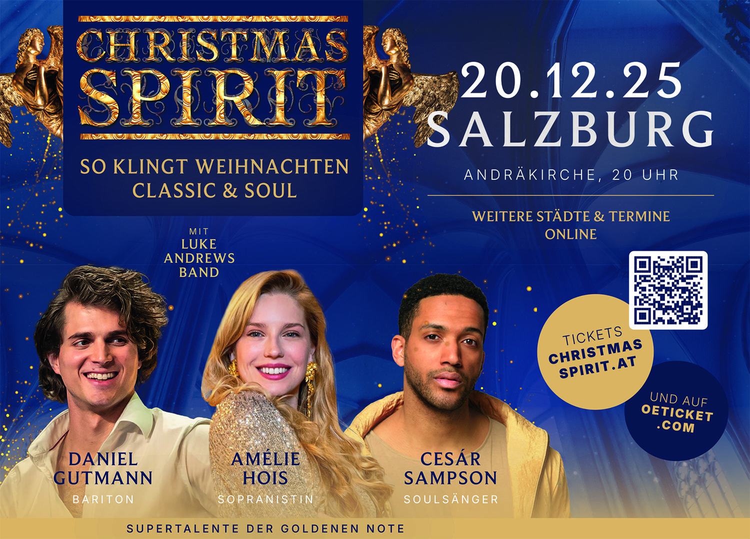 Tauchen Sie ein in die festliche Atmosphäre der St. Andrä Kirche in Salzburg und genießen Sie die magischen Weihnachtsklänge von Christmas Spirit. Mit einer Mischung aus klassischen und souligen Weihnachtsliedern, präsentiert von Superstars wie Daniel Gutmann, Amelie Hois und César Sampson, wird dieses Konzert zu einem unvergesslichen Erlebnis.