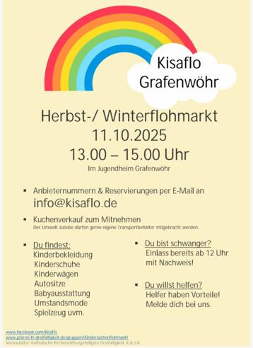 Herbst - / Winterflohmarkt am 11.10.25 im Jugendheim in GrafenwöhrDu findest: Kinderbekleidung, Kinderschuhe, Kinderwägen, Autositze, Babyausstattung, Umstandsmode, Spielzeug uvm.Für Schwangere Einlass bereits ab 12 Uhr mit Nachweis!Kuchenverkauf zum Mitnehmen!