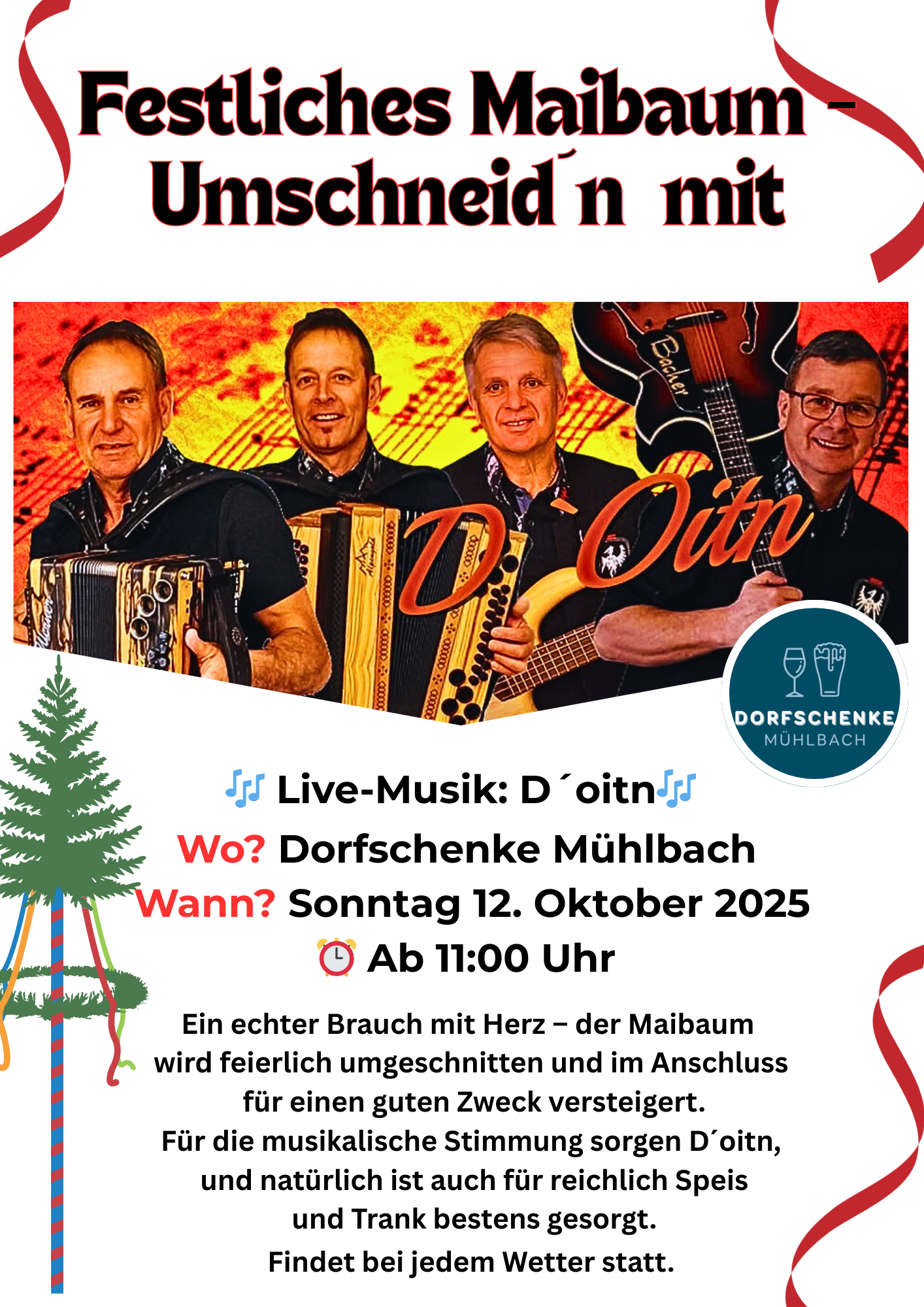 Für die musikalische Stimmung dorgen d'Oitn. Für Speis und Trank ist gesorgt. Findet bei jeder Witterung statt.