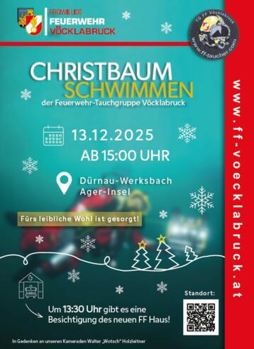 Es ist wieder soweit! Die Feuerwehr-Tauchgruppe Vöcklabruck lädt wieder zum traditionellen Christbaumschwimmen am 13. Dezember in Dürnau/Werksbach/Ager-Insel ein!