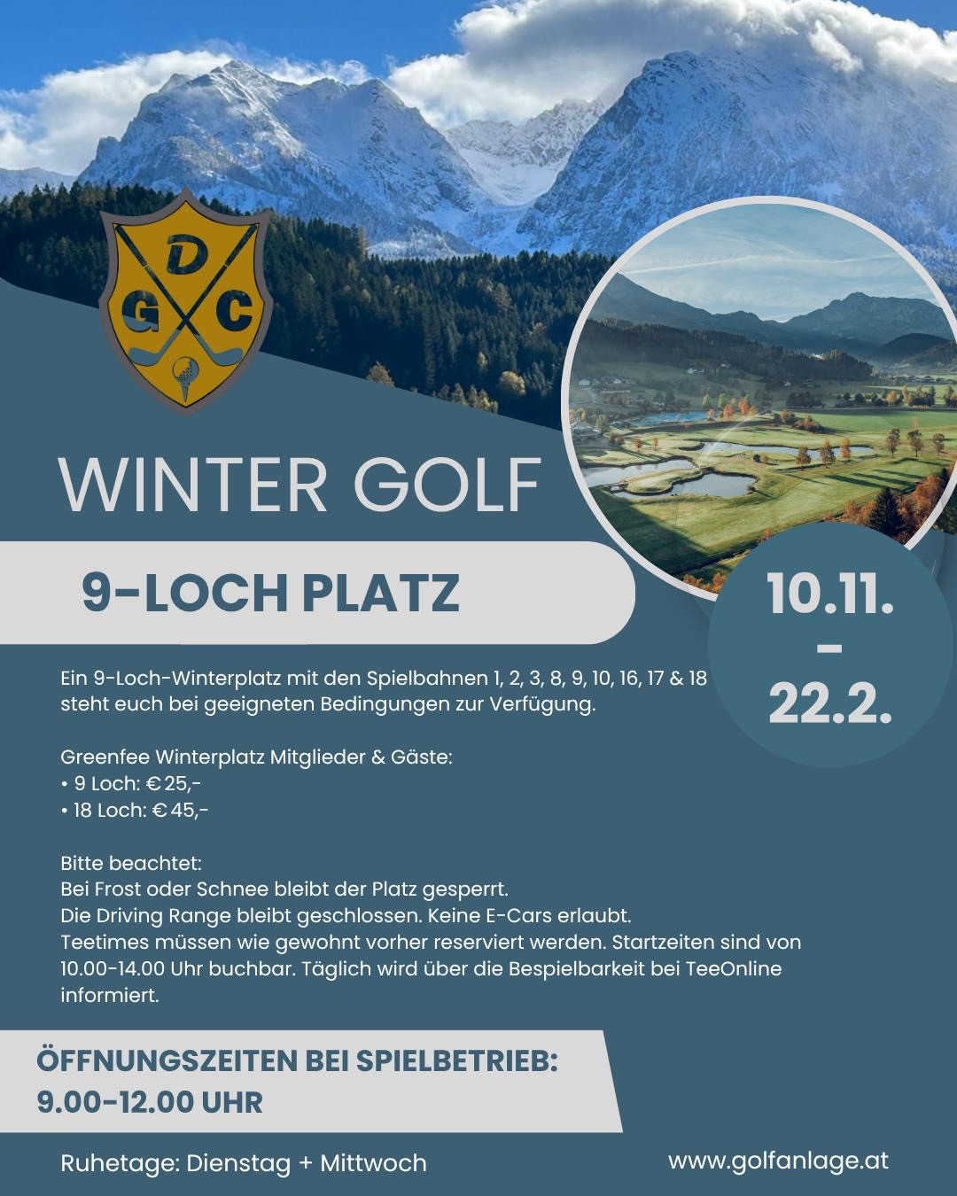 Ein 9-Loch-Winterplatz mit den Spielbahnen 1,2,3,8,9,10,16,17,18 steht euch bei geegneten Bedingungen zur Verfügung.