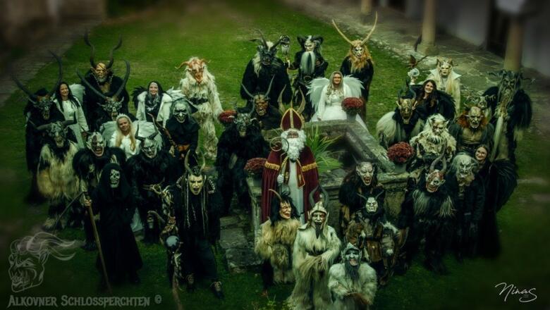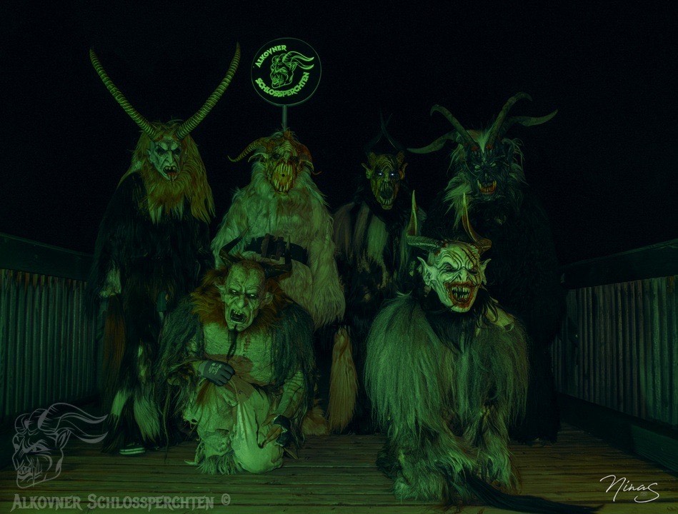 30minütige Perchtenshow der Alkovner Schlossperchten mit Hexen, Engerl, Tod, Feuerspucker und Perchten.