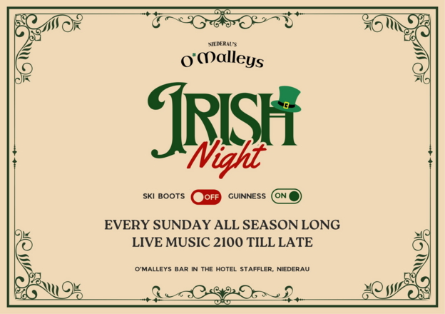 Jeden Sonntagabend während der gesamten Saison verwandelt sich O’Malley’s im Hotel Staffler in den perfekten Treffpunkt für eine authentische Irish Night. Live-Musik erfüllt die Bar ab 21:00 Uhr bis spät in die Nacht, begleitet von einem großartigen Pint Guinness, einer feinen Auswahl traditioneller irischer Whiskeys sowie thematischen Cocktails und Shots. Die lebendige Atmosphäre lässt sich sowohl in der Bar als auch auf der beheizten Terrasse genießen. Fordere deine Freunde zu einer Runde „Nails“ heraus und verfolge alle Live-Sportübertragungen im TV – ein echtes Irish-Pub-Erlebnis im Herzen der Alpen.