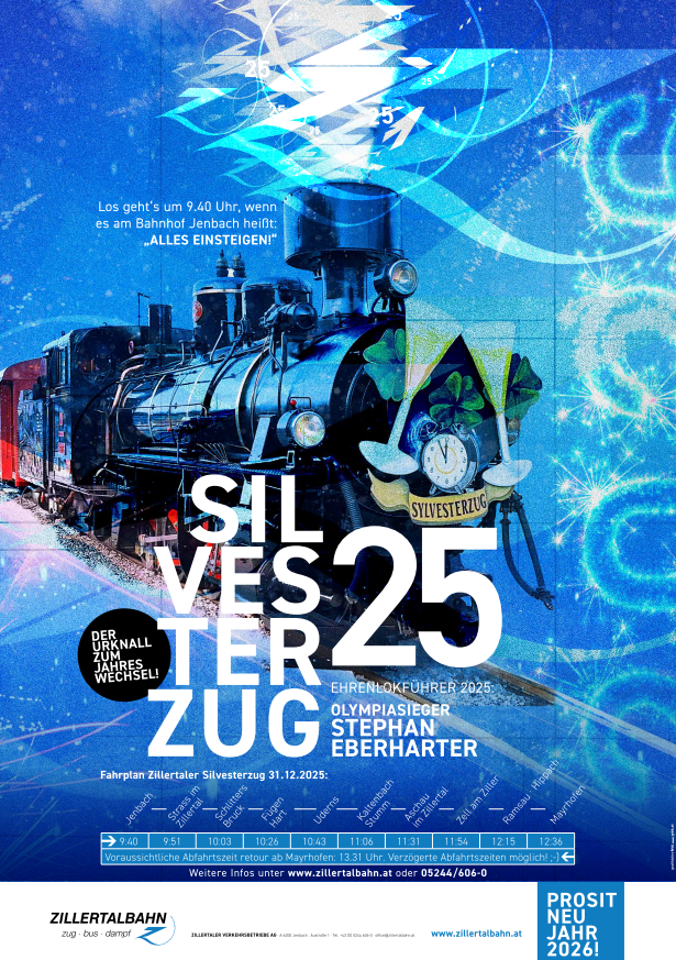Der legendäre Silvesterzug der Zillertalbahn ist wieder unterwegs! Die Fahrt startet um 09.40 Uhr in Jenbach. Ein besonderes Highlight: Olympiasieger Stephan Eberharter begleitet den Zug als Ehrenlokführer.