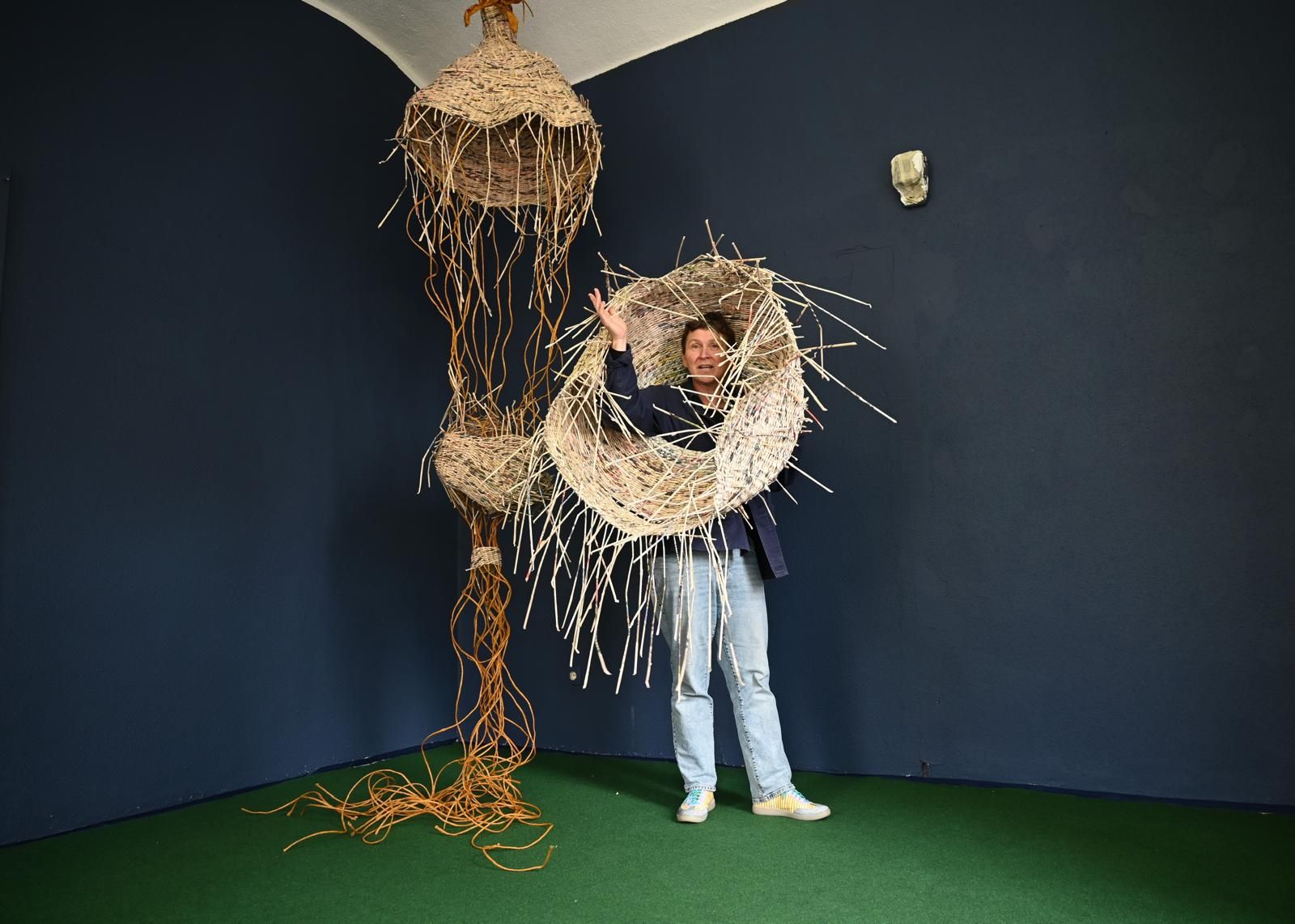 In der Flechtwerkstatt von Nicole Kudla experimentiert die Künstlerin mit verschiedenen Materialien und Techniken. Aktuell steht Papier im Vordergrund. Sie zeigt im mük unterschiedliche Objekte, die sowohl funktionell als auch dekorativ sind. So erzählt etwa das Ausstellungsstück „Prothese“ von der Transformation von wertlos gewordenem Zeitungspapier zu einem dauerhaften Objekt. „Zeitungspapier ist alltägliches, vergängliches Material. Im Geflecht verarbeitet ist das neue Objekt körperlich, benutzbar, aber nicht mehr lesbar. Der Akt des Flechtens macht aus dem vergänglichen Medium ein dauerhaftes Objekt. Wie eine Prothese ersetzt dieses etwas Verlorenes, Vergängliches“, so erklärt Nicole Kudla ihre Arbeit.