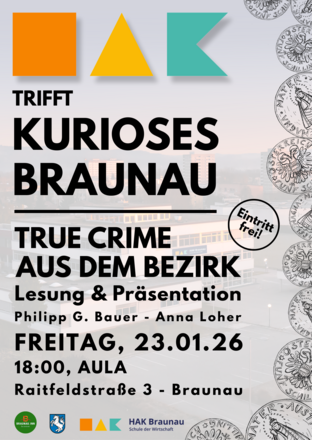 Unter dem Titel „HAK trifft Kurioses Braunau: True Crime aus dem Bezirk“ nimmt Bauer das Publikum mit auf eine spannende Reise in die dunklen Kapitel der regionalen Geschichte. Die vorgestellten Fälle basieren auf realen Begebenheiten und zeichnen ein ebenso beklemmendes wie faszinierendes Bild von Verbrechen, Motiven und menschlichen Abgründen – sachlich recherchiert, packend erzählt und stets mit regionalem Bezug.