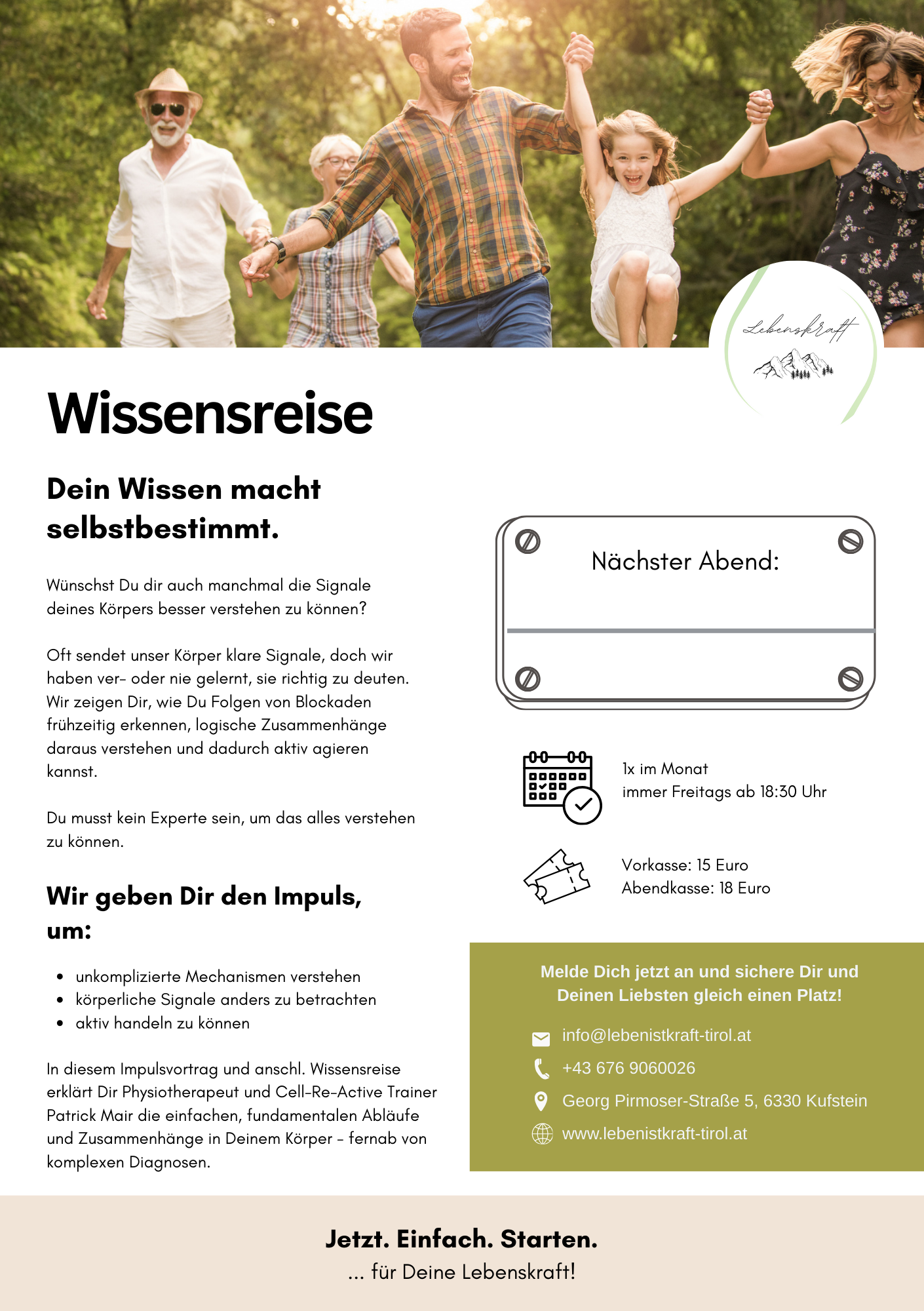 In diesem Impulsvortrag und anschl. Wissensreise erklärt Dir Physiotherapeut und Cell-Re-Active Trainer Patrick Mair die einfachen, fundamentalen Abläufe und Zusammenhänge in Deinem Körper - fernab von komplexen Diagnosen.