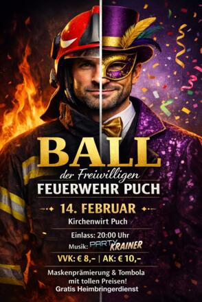 Traditioneller Faschingsball der Freiwilligen Feuerwehr Puch bei Hallein, jährlich am Faschingssamstag ab 20.00 Uhr beim Gasthof zum Kirchenwirt.