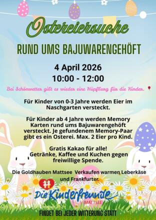 Die Kinderfreunde Mattsee laden am Samstag, 04. April von 10:00 bis 12:00 Uhr zum Ostereiersuchen in das Bajuwarengehöft in der Weyerbucht in Mattsee ein.