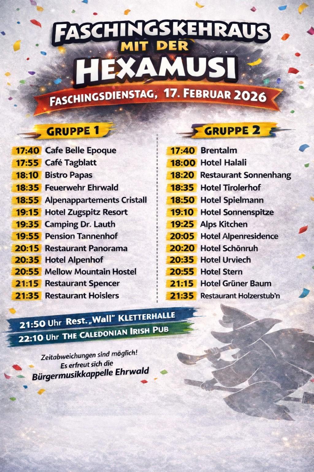 Der Faschingskehraus mit der Hexamusi in Ehrwald ist der traditionelle Abschluss der närrischen Zeit und findet am Faschingsdienstag statt.