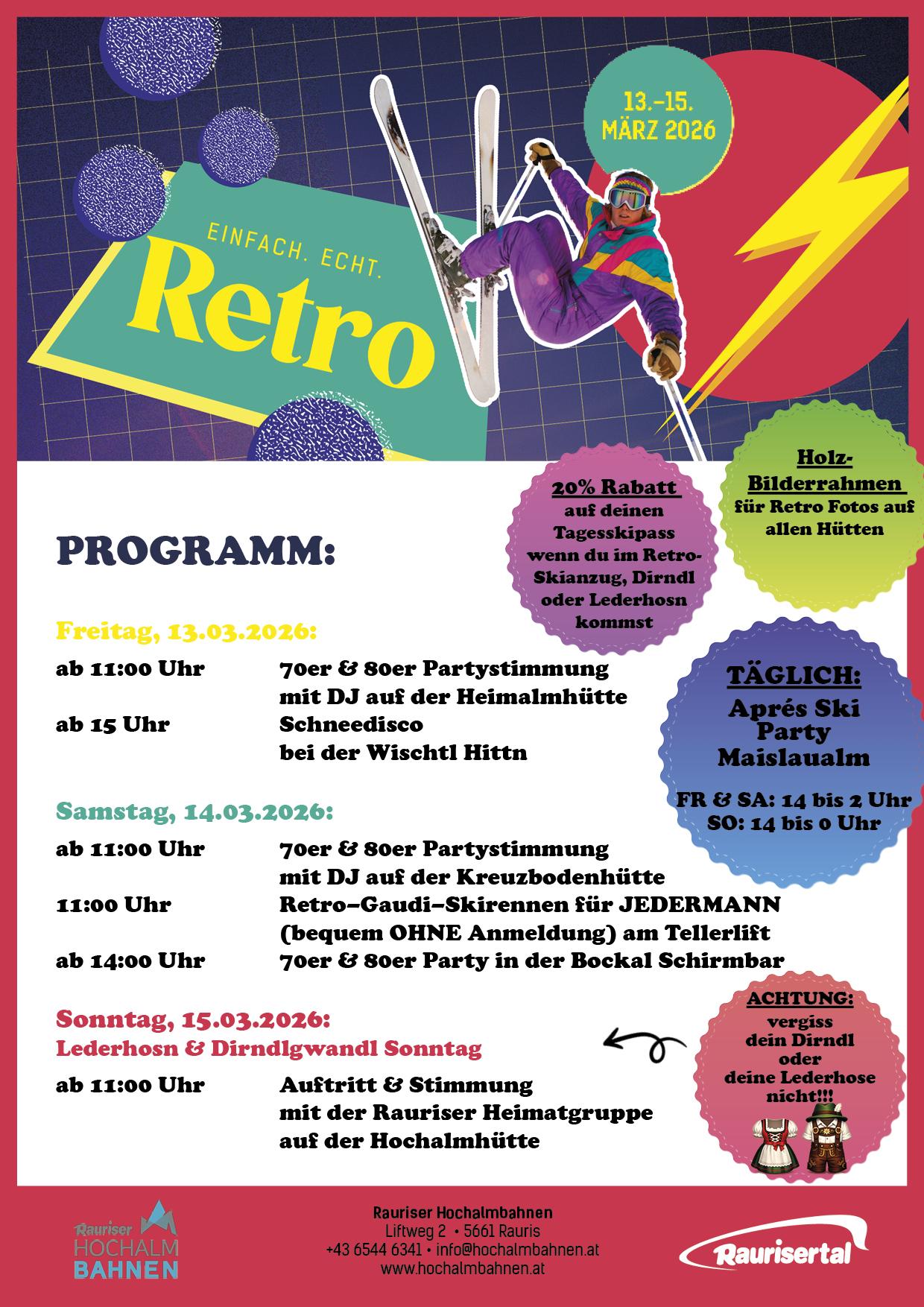 Pack dein Retro-Outfit ein und erlebe „Ein Winter wie damals“ im Raurisertal: Sonnenskilauf, nostalgisches Hüttenflair und jede Menge Spaß – ein Wochenende wie aus einer anderen Zeit.