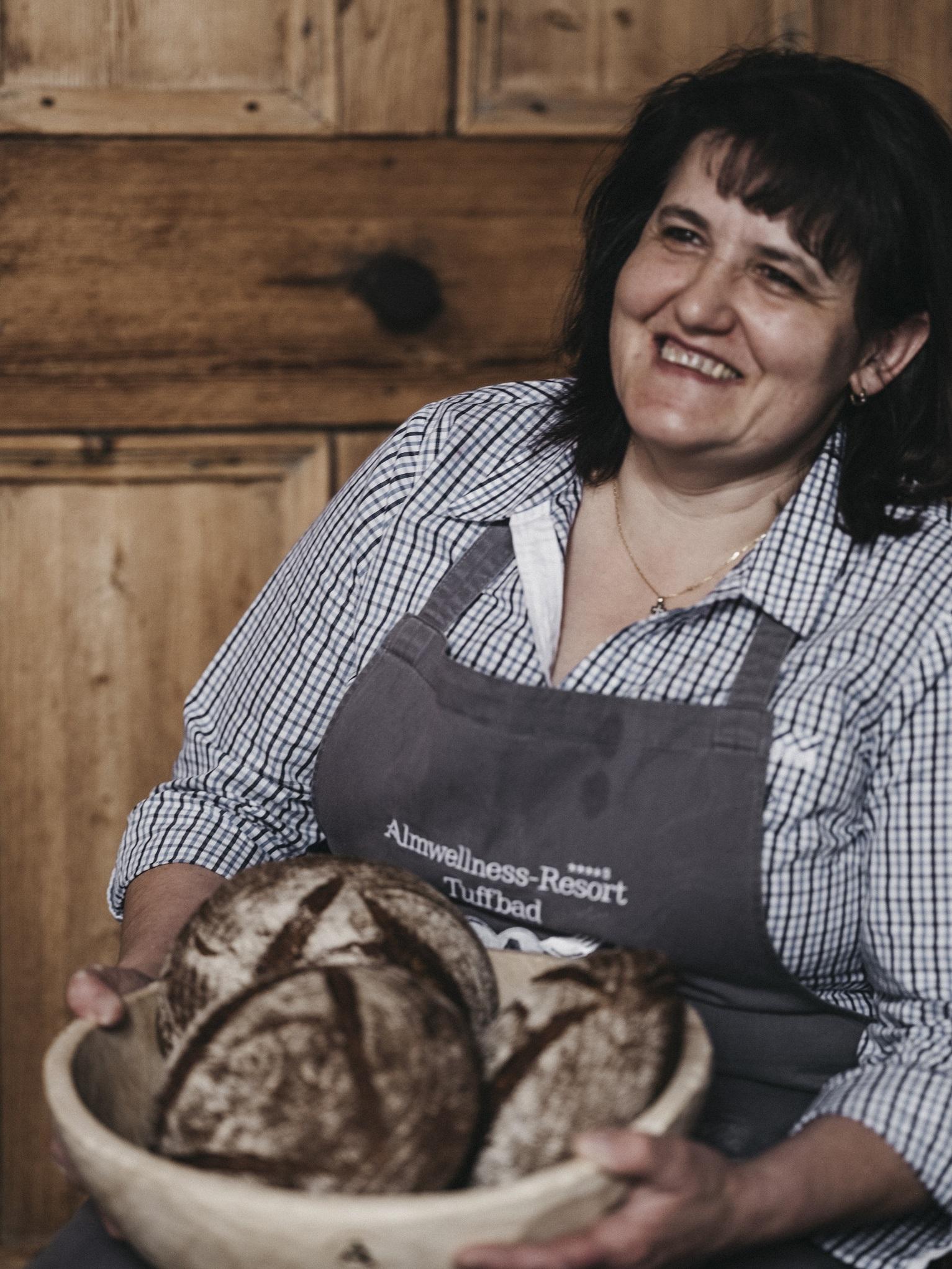Natürliches Sauerteigbrot tut dem Menschen gut. Das wissen die Brotbäuerinnen im Lesachtal und daher backen sie Brot auch mit dem im Tal angebauten Korn. Unter Anleitung der Bergbäuerin heißt es Ärmel aufkrempeln und zupacken. Wie Sauerteig angesetzt, die richtige Mehlmischung gefunden und mit Wasser und Salz der Teig hergestellt wird, kannst Du beim Brotbacken im komfortablen Almwellnesshotel Tuffbad erfahren. Die selbst geformten Brotlaibe mit den seit Urzeiten überlieferten Brotstempeln schiebst Du dann in den gut geheizten Steinofen. Während das Brot gebacken wird, erzählt Dir die Brotbäuerin viel über die Geschichte des Lesachtaler Brotes, das so viele unterschiedliche Geschmäcker hat wie es Brotbäuerinnen im Tal gibt. Wenn der Brotschatz dann aus dem Ofen kommt, bleibt der Duft des frischen Brotes unvergesslich in Erinnerung. Mit frischer Bauernbutter schmeckt das frische Brot besonders gut.