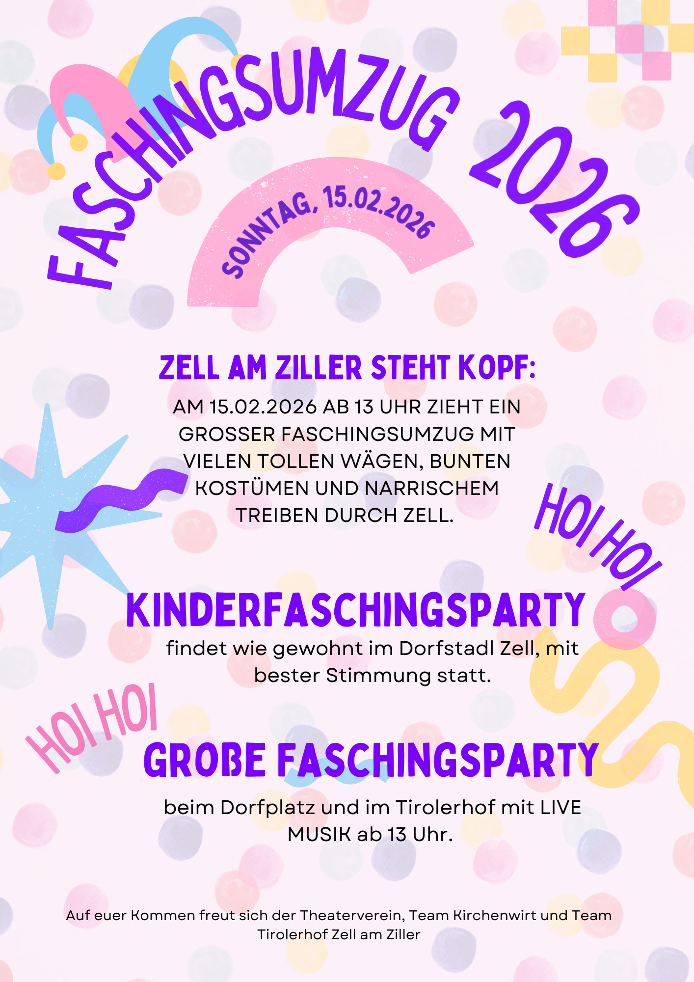 Große Faschingsparty beim Dorfplatz und im Tirolerhof mit Live Musik ab 13:00 Uhr!
