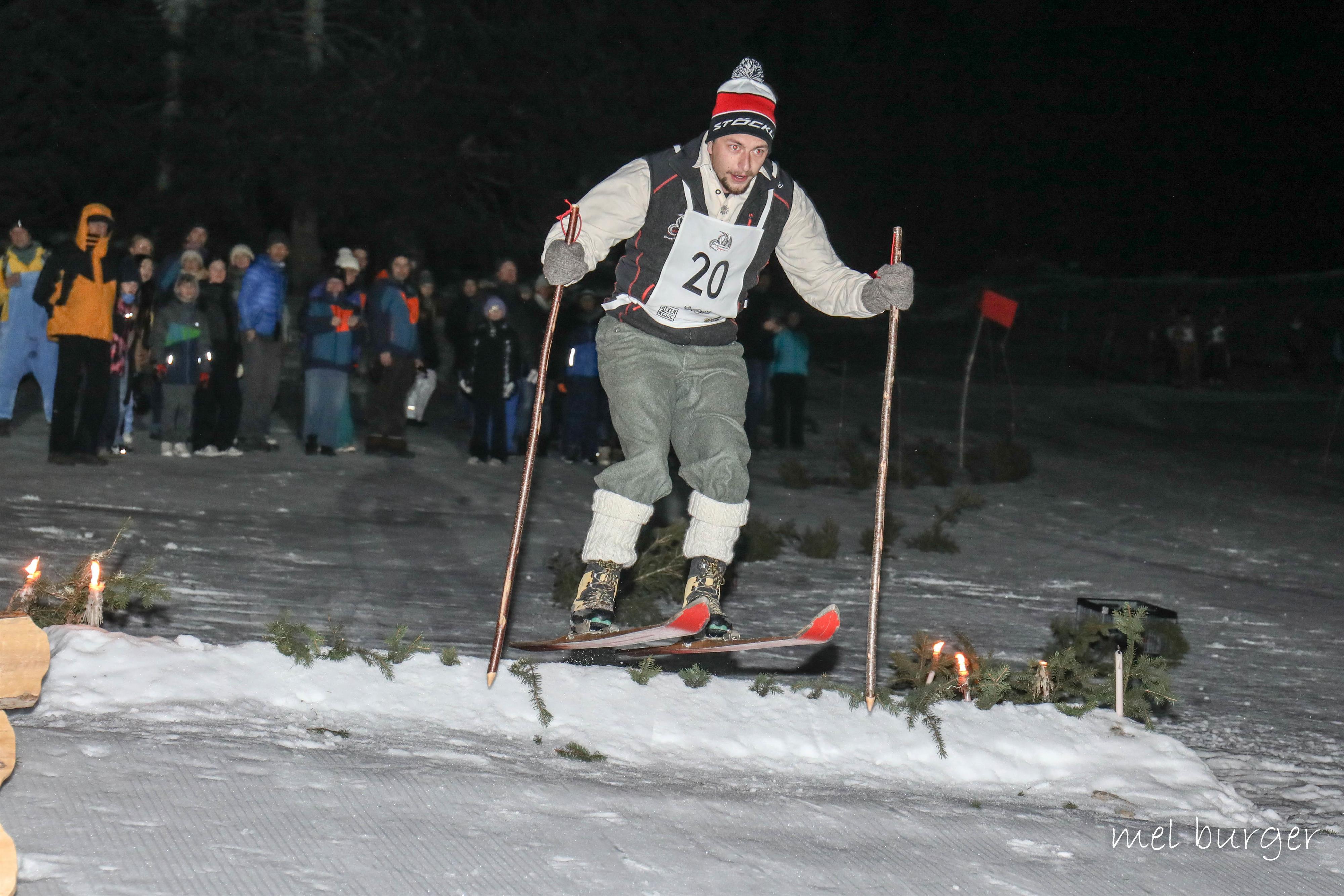 Ausrüstung: Alte Ski Mindestlänge Herren 2 m, Mindestlänge Damen 1,80 m mit aufgeschraubter Stahlkante (kein Kunstoffbelag), Nostalgie gekleidet.