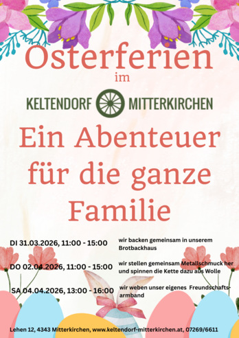 Am 28. März startet das Keltendorf Mitterkirchen in die neue Saison – und damit auch in ein spannendes Osterferienprogramm für die ganze Familie! An beiden Wochenenden finden kostenlose Führungen um 11:00 und 14:00 Uhr durch die rekonstruierte Siedlung statt, bei denen das Leben vor 2700 Jahren lebendig wird. Der Eintritt bleibt wie gewohnt. Bitte beachten: Materialkosten sind nicht im Eintritt enthalten. Die Aufsichtspflicht liegt während der Veranstaltungen bei den Eltern. |