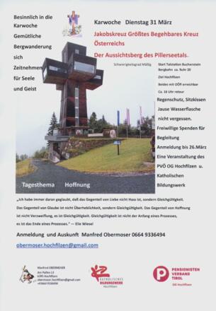 Gemütliche Bergwandrung - besinnlich in die Karwoche: Zeitnehmen für Seele und Geist | Dauer: Ca. 6h | Info & Anmeldung: bis 26. März, beim Herrn Manfred Obermoser telefonisch: +43 664 93 36 494 oder per E-Mail: obermoser.hochfilzen@gmail.com | Kosten: Freiwillige Spenden für Begleitung | Treffpunkt: ca. um 09:20 Uhr, Talstation Bergbahn Pillersee Buchensteinwand. Ziel: ca. um 16:00 Uhr in Hochfilzen | Hinweis: Schwierigkeitsgrad der Wanderung: mäßig | Sonstiges: Regenschutz, Sitzkissen, Jause und Wasserflasche nicht veressen