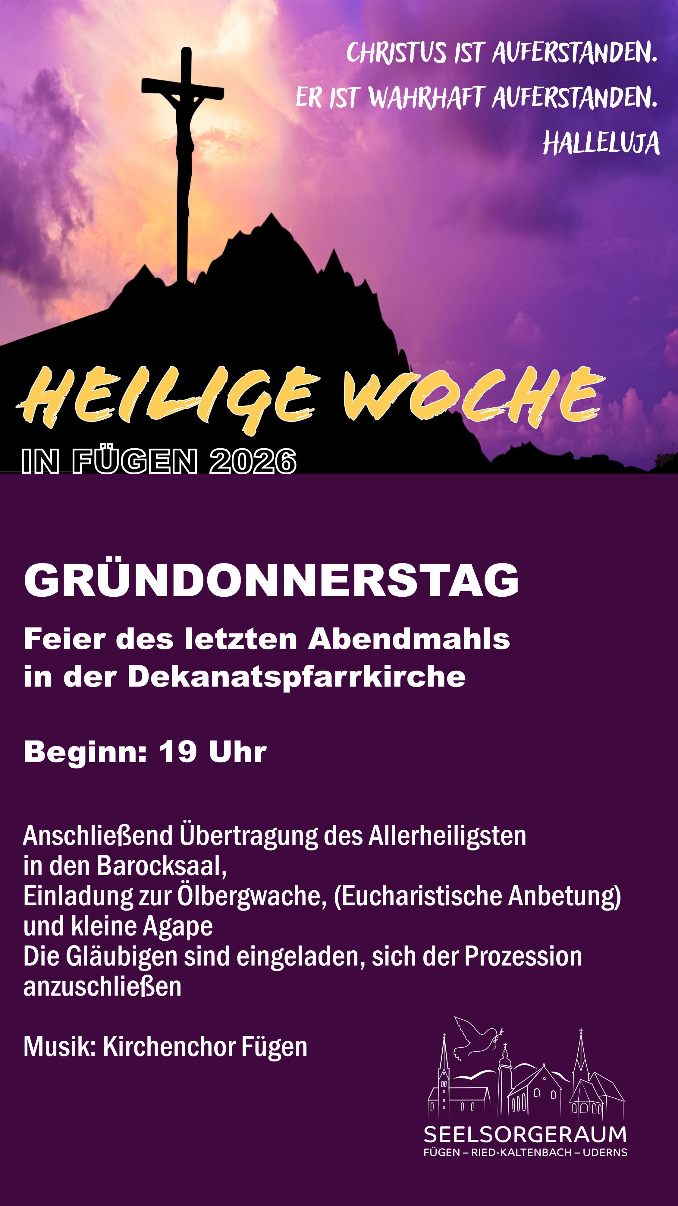 Gottesdienst zum Gedächtnis des Letzten Abendmahls in der Dekanatspfarrkirche, danach feierliche Übertragung des Allerheiligsten in den Barocksaal. Im Anschluss Einladung zur Ölbergandacht und zur kleinen Agape.