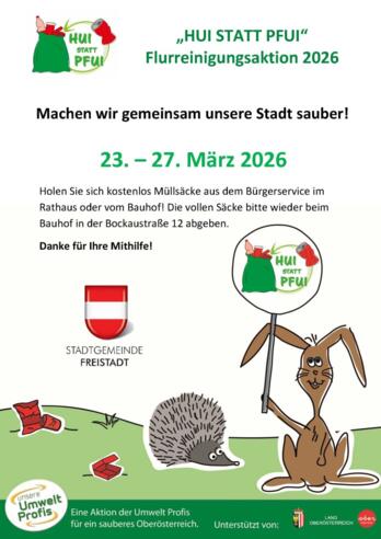 „Hui statt Pfui“ – unter diesem Motto wird in ganz Oberösterreich Müll gesammelt. Wir halten diese landesweite Aktion der Umwelt Profis für sehr sinnvoll und machen gerne mit. Wir freuen uns, wenn wir dabei Unterstützung von vielen Freiwilligen bekommen!