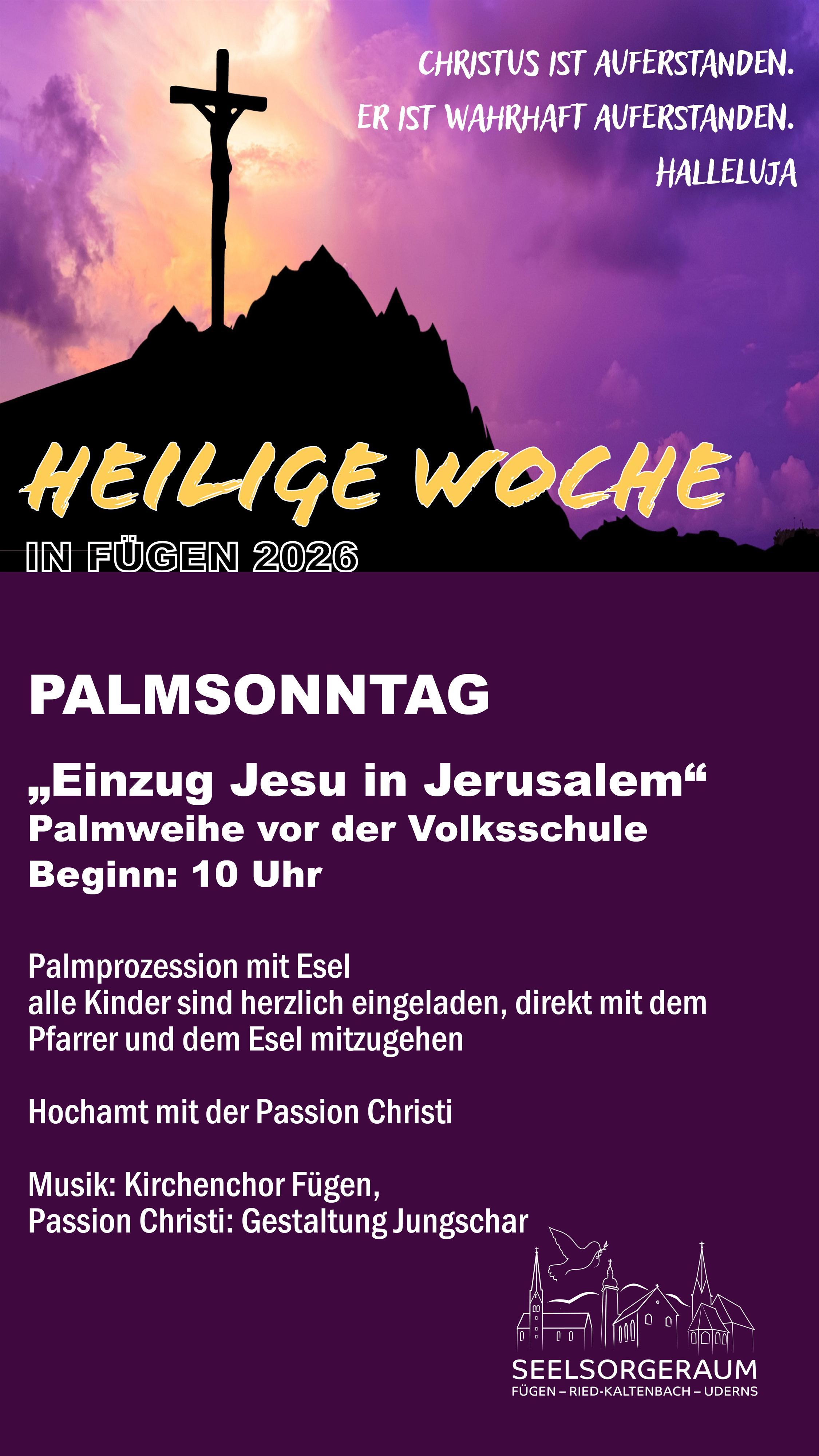 Segnung der Palmzweige vor der Volksschule, anschließend Palmprozession mit Esel zur Pfarrkirche.