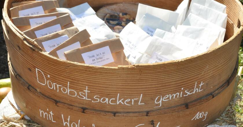 Kulinarisches aus der Region, Holzofenbrot, Bauernkrapfen, Obst aus dem Dörrofen und Erdäpfel aus dem Dämpfer.