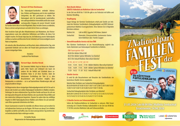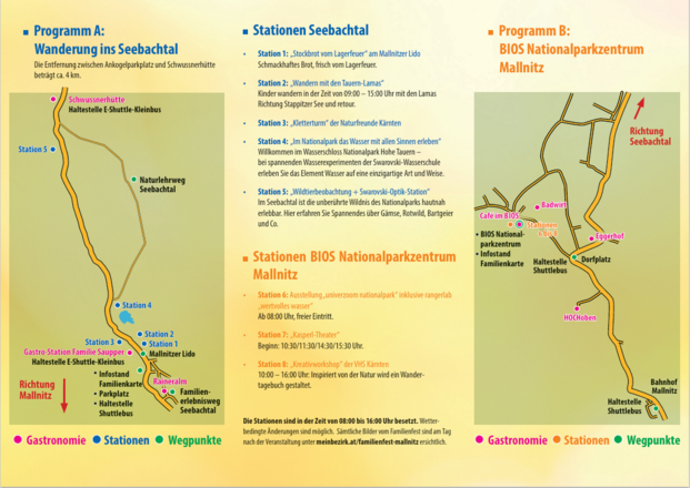 Gegen Vorlage der Kärntner Familienkarte erhält jede Familie am Infostand der Kärntner Familienkarte (Ankogelparkplatz und BIOS Nationalparkzentrum) Essensgutscheine. (Einlösbar: Eggerhof, Restaurant HOCHoben, Badwirt, Raineralm, Schwussnerhütte, Gastronomie Station I Mallnitzer Lido vom Bauernhof Saupper)