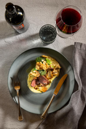 Schritt für Schritt führt der Weg durch Vorchdorf: entlang der idyllischen Laudach, über den Schlossplatz, hinein in eine Welt voller Geschmack und Begegnungen. Bei Jo’s Restaurant erwartet die Gäste ein raffiniert komponierter Zwischengang – zweierlei Ravioli vom Wild, inspiriert von Wald und See, veredelt mit feinem Tannenwipfelschaum. Ein Gericht, das Natur und Handwerk auf den Punkt bringt.