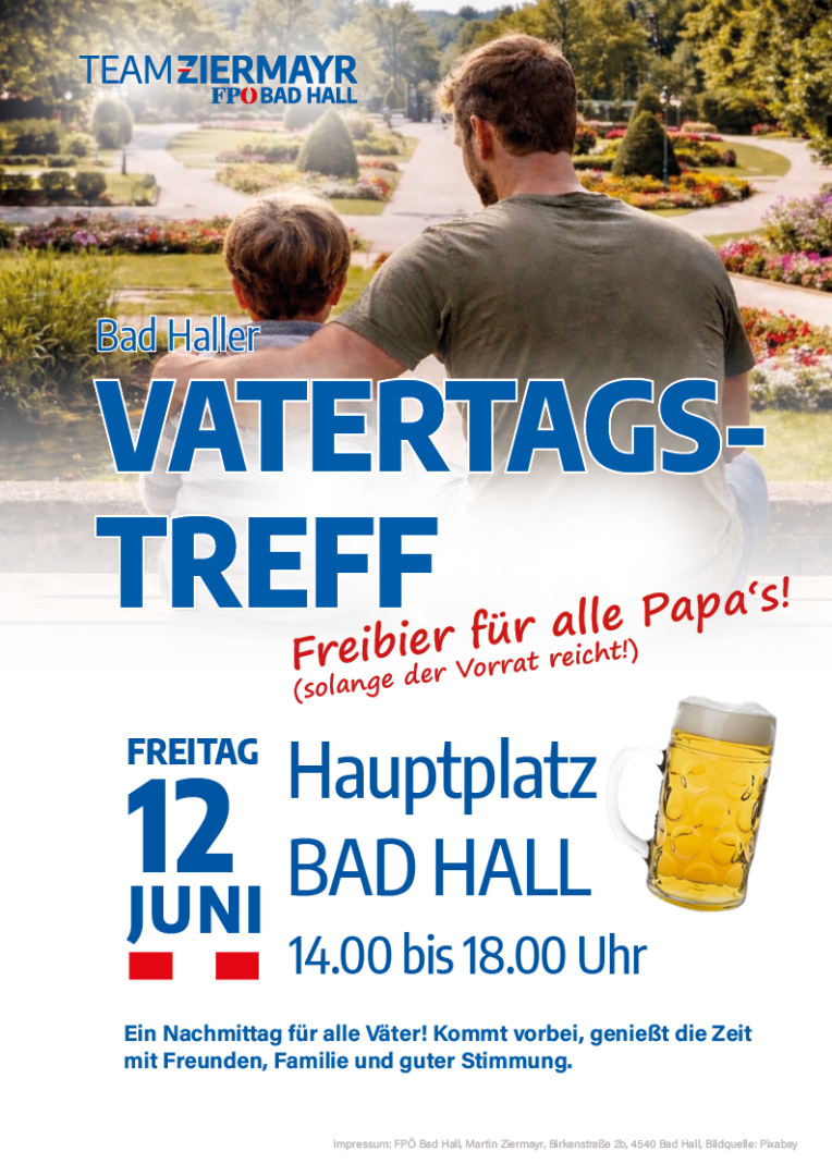 Am 12. Juni lädt die FPÖ Bad Hall herzlich zur Vatertagsveranstaltung ein. Gefeiert wird direkt vor dem Geschäft Öllinger in Bad Hall – und zwar von 14:00 bis 18:00 Uhr.