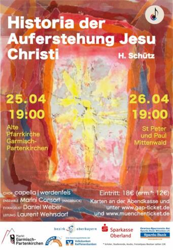 Am 4. Sonntag der Osterzeit erklingt in Garmisch und Mittenwald Heinrich Schütz’ „Historia der Auferstehung. Der Garmischer Chor capella|werdenfels und das Barockensemble Marini Consort aus Innsbruck musizieren.