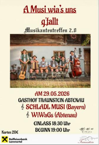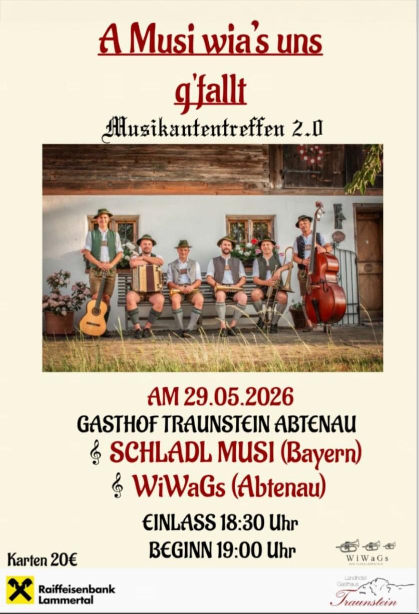 Freut euch auf einen unvergesslichen Abend mit den WiWaGs und der Schladl Musi – beste Volksmusik, gute Stimmung und echte Gaudi garantiert!
