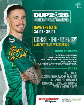 Seien Sie dabei, wenn vom 24. bis 26. Juli 2026 in Kirchbichl in Tirol der 1. Marco Friedl Cup ausgetragen wird. Ein neues internationales Fußballhighlight inmitten der beeindruckenden Tiroler Bergwelt. Bei der Premiere des Turniers treffen 16 internationale Teams aufeinander und messen sich auf hervorragend gepflegten Rasen- und Kunstrasenplätzen. Der Marco Friedl Cup bietet jungen Talenten eine Bühne, auf der sie sich sportlich beweisen und gleichzeitig wertvolle internationale Erfahrung sammeln können. Gemeldet werden können maximal 12 Spieler*innen und 3 Betreuer*innen pro Mannschaft. Freuen Sie sich auf ein energiegeladenes Fußballwochenende voller Einsatz, Emotionen und spannender Begegnungen – eingerahmt von der malerischen Umgebung Kirchbichls und der besonderen Atmosphäre einer Turnierpremiere.